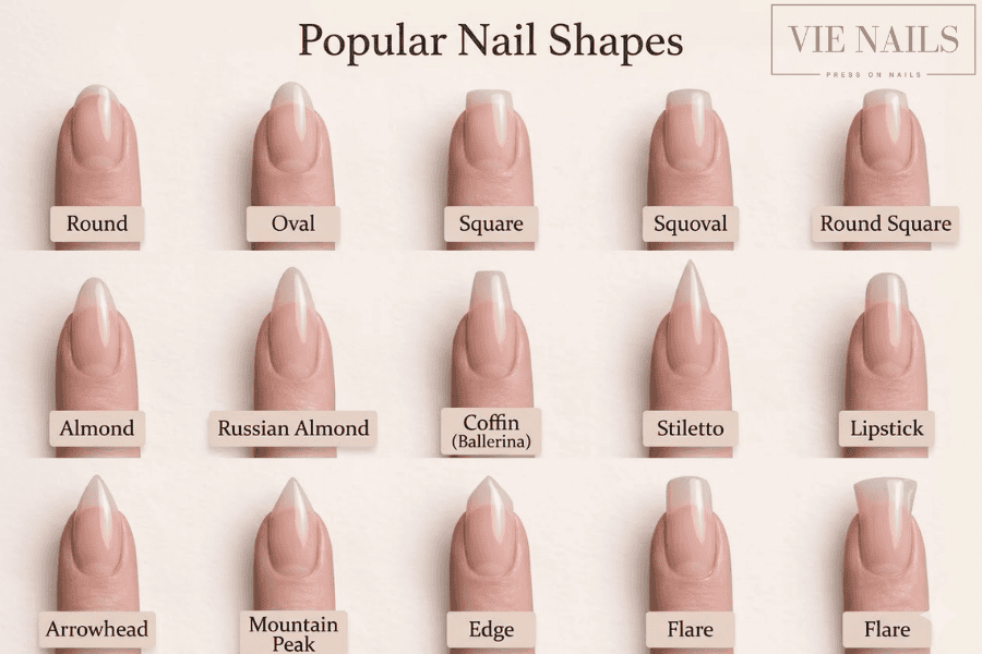 Guide to popular nail shapes for 3D press on nails showing short oval, almond, coffin, and square shapes with design examples